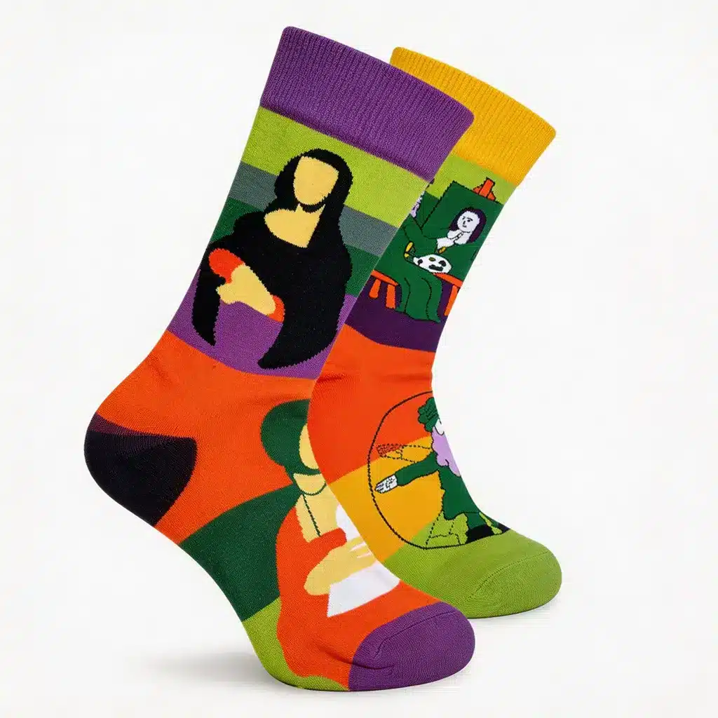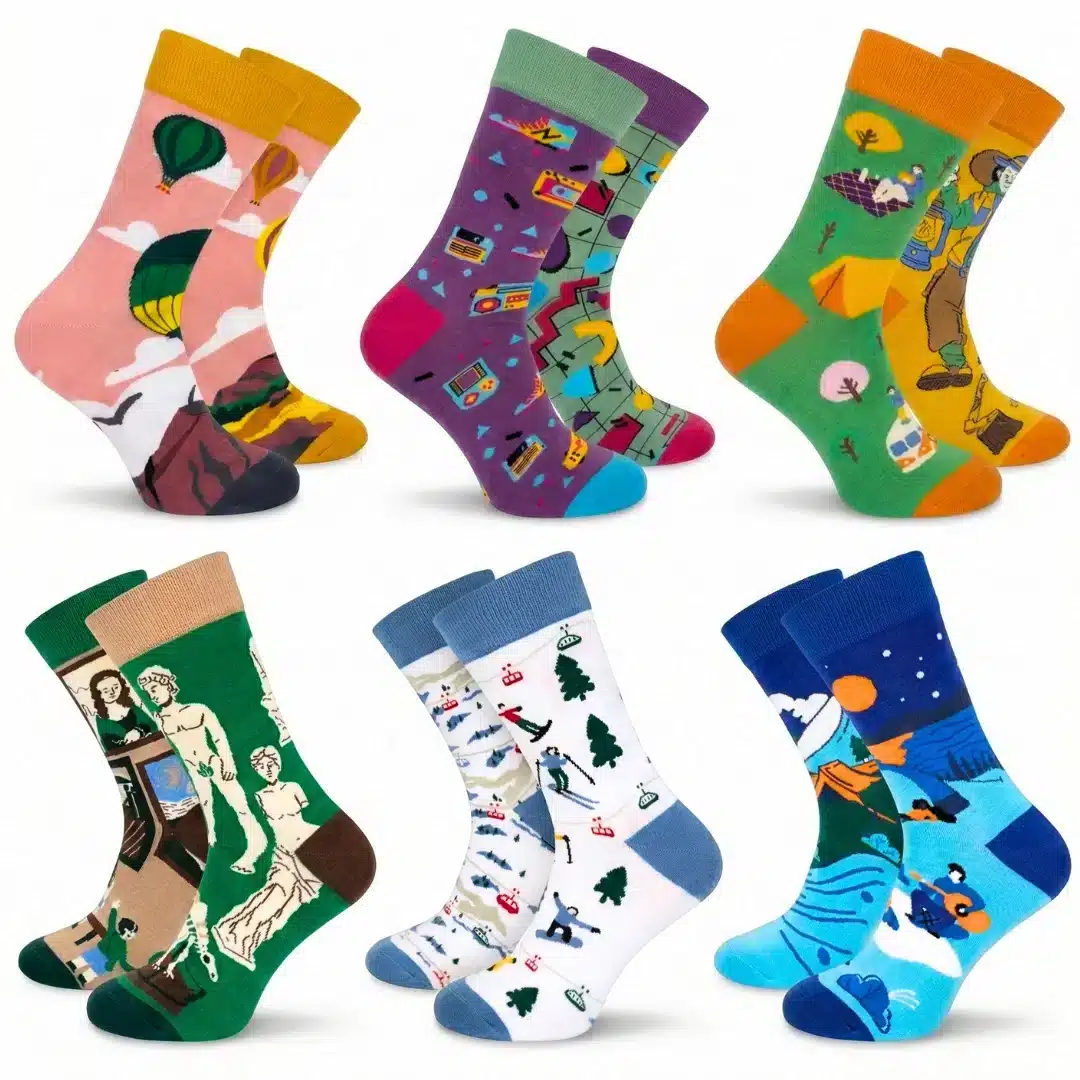 Umělecký motiv dává celé sadě charakter, ale bez přehánění. Pořád dostaneš pohodlné nepárové ponožky, které se dobře nosí, dobře sedí a ráno nevypadají jako další nudná povinnost.